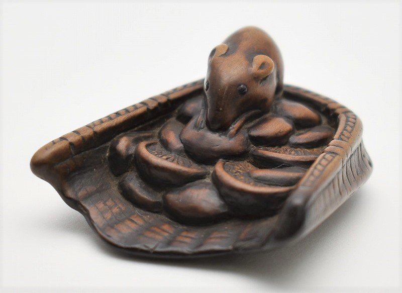 石川県小松市のお客様に出張買取にてご依頼頂き、時代 提物 細密彫刻 振い籠に鼠 ネズミ根付を買取りさせて頂きました。