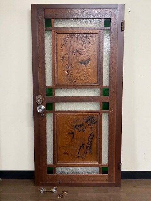 石川県白山市のお客様に出張買取にてご依頼頂き、アンティーク建具 松と鶴/竹と雀図彫ステンドグラス ドアを買取りさせていただきました。