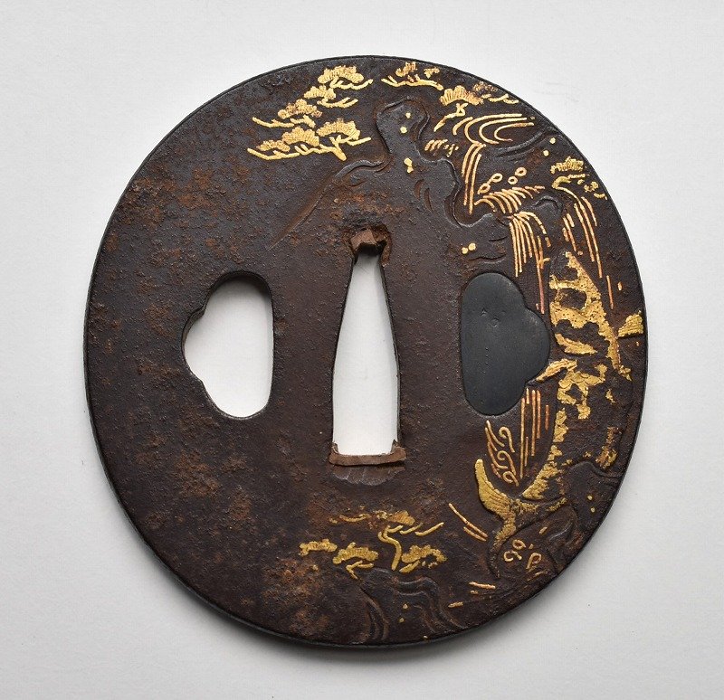 福井県あわら市のお客様に出張買取にてご依頼頂き、時代 刀装具 武具 鍔 鉄鍔 鐵鍔 木瓜形 象嵌 鯉の滝登り図を買取りさせて頂きました。