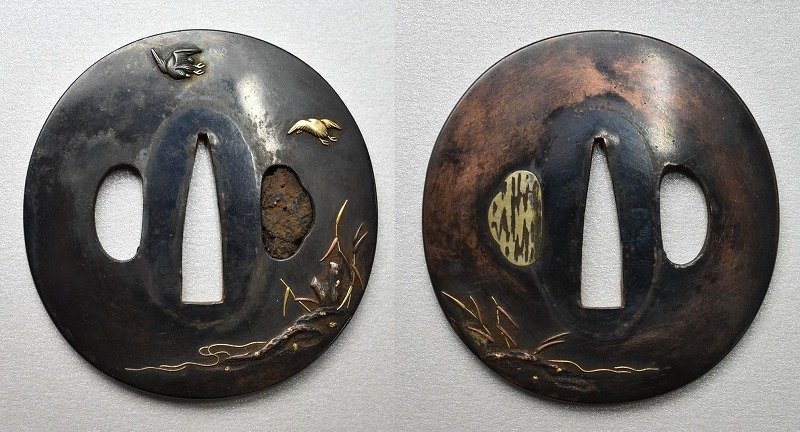 福井県福井市のお客様に出張買取にてご依頼頂き、時代 刀装具 武具 銅地 丸形 銅鍔 鳥図盛象嵌 鍔を買取りさせて頂きました。