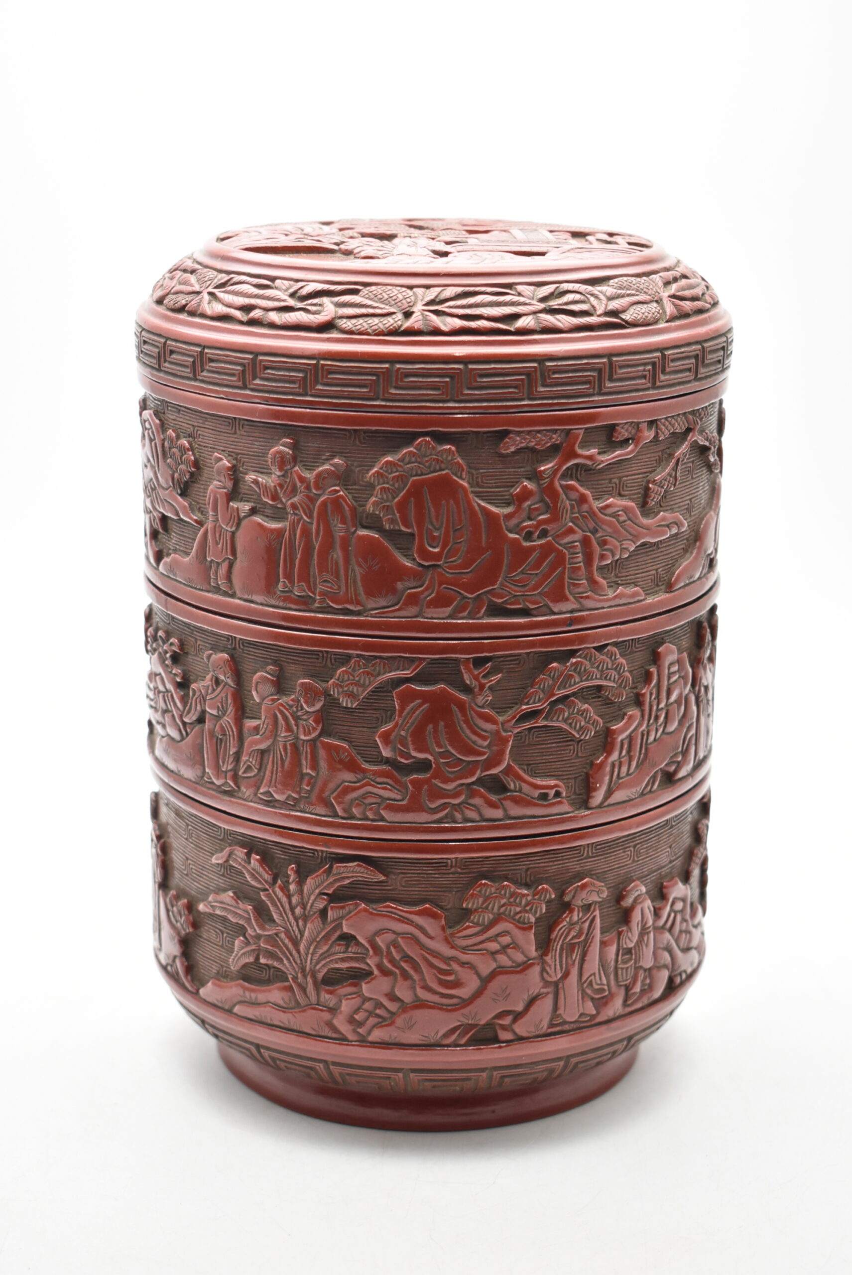 福井県越前市のお客様より◆時代 中国骨董 楼閣山水図 堆朱 丸重箱◆をお買取り。