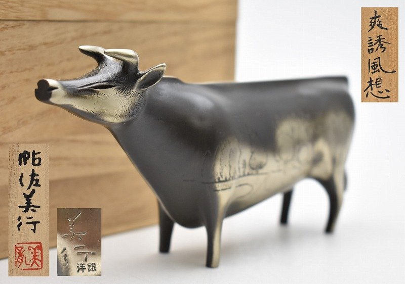 福井県鯖江市のお客様に出張買取にてご依頼頂き、文化勲章受章作家 帖佐美行 洋銀 爽誘風想 干支 丑 牛 置物を買取りさせて頂きました。