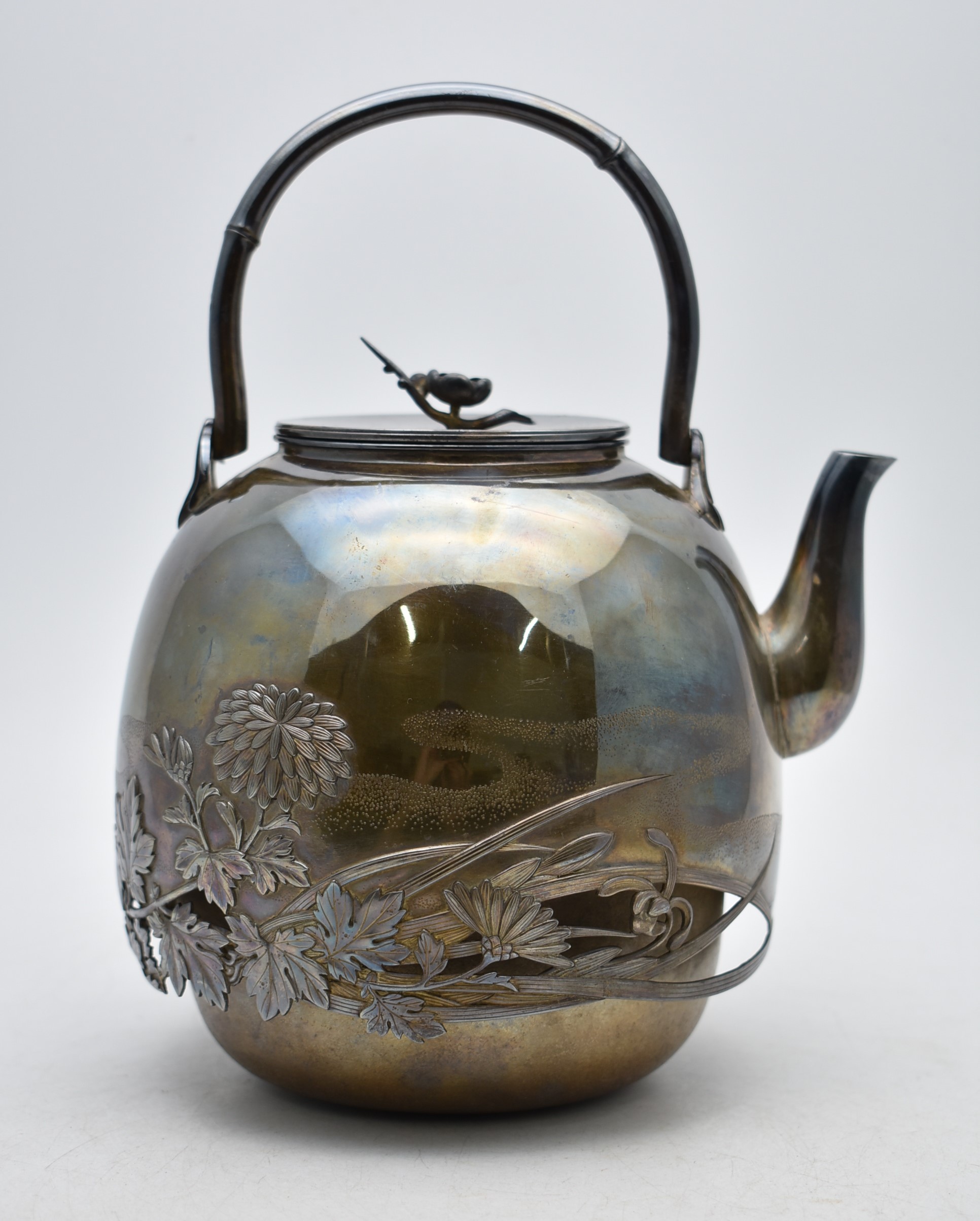 福井県鯖江市のお客様に出張買取にてご依頼頂き、時代 金工師造 花摘蓋 竹文弦 菊葉紋 銀瓶 銀急須を買取りさせて頂きました。