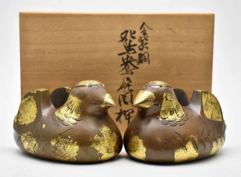 石川県野々市市のお客様に出張買取にてご依頼頂き、銅器 金紫銅 鴛鴦屏風押さえ 一対を買取りさせて頂きました。