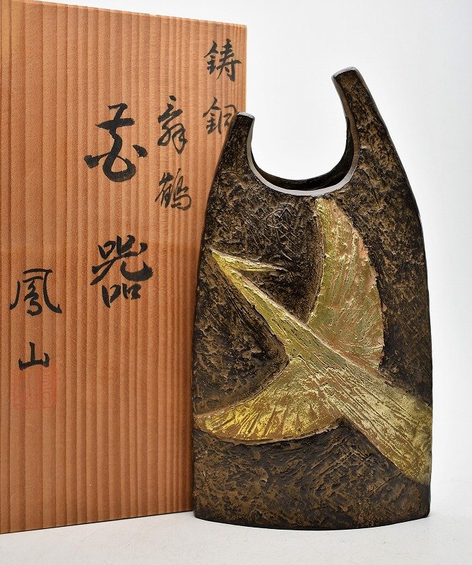 富山県小矢部市のお客様に出張買取にてご依頼頂き、高岡銅器 山本鳳山 鋳銅 象嵌飛鶴 花器 を買取りさせていただきました。