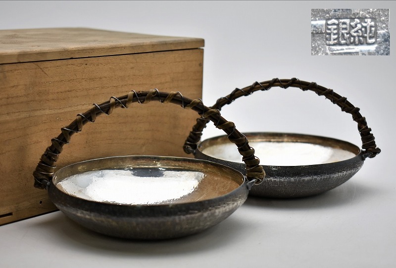 石川県加賀市のお客様より出張買取にてご依頼頂き、純銀製 手付盆 菓子盆 菓子器 果物 一対を買取りさせていただきました。