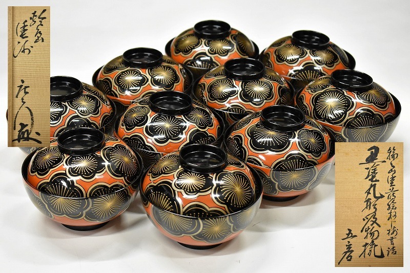 古道具買取【石川県七尾市】のお客様より◆輪島塗 布着堅地漆器 大崎庄右衛門 蒔絵ねじ梅 黒塗丸形 吸物椀◆をお買取り。