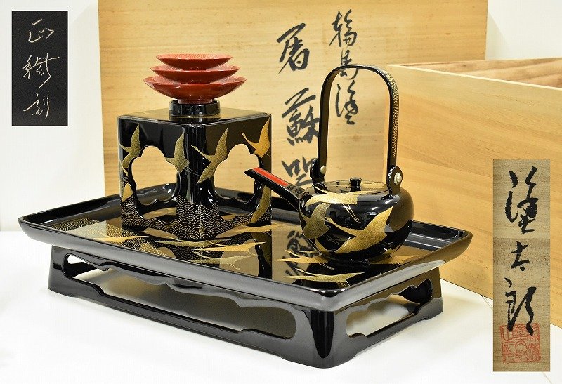 輪島塗買取 輪島塗買取石川県金沢市◆輪島塗 塗師 塗太郎 沈金師 吠木正樹 鶴青海波文 屠蘇器揃◆をお買取り。石川県金沢市のお客様に出張買取にてご依頼頂き、輪島塗 塗師 塗太郎 沈金師 吠木正樹 鶴青海波文 屠蘇器揃を買取りさせて頂きました 未使用品。盃 盃台 銚子 屠蘇台 懐石道具 石川県 福井県 九谷焼買取 骨董品買取 茶道具買取 アンティーク買取 古道具買取