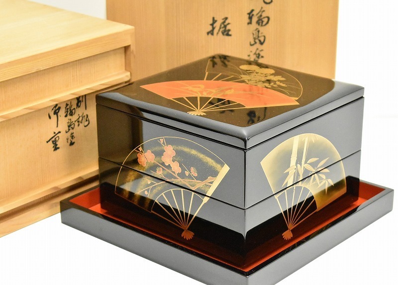 九谷焼・輪島塗 九谷焼・輪島塗【石川県加賀市】のお客様より◆輪島塗 蒔絵 扇面草花図 二段重 重箱◆をお買取り。石川県加賀市のお客様より出張買取にてご依頼頂き、輪島塗 蒔絵 扇面草花図 二段重 重箱を買取りさせていただきました。 重台付き。共箱あり。美品。