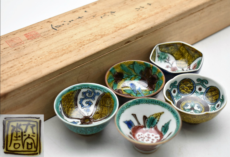 九谷焼買取【石川県金沢市】のお客様より◆九谷焼 名工 初代徳田八十吉 古九谷敬慕 絵変 酒盃 五客揃◆をお買取り。
