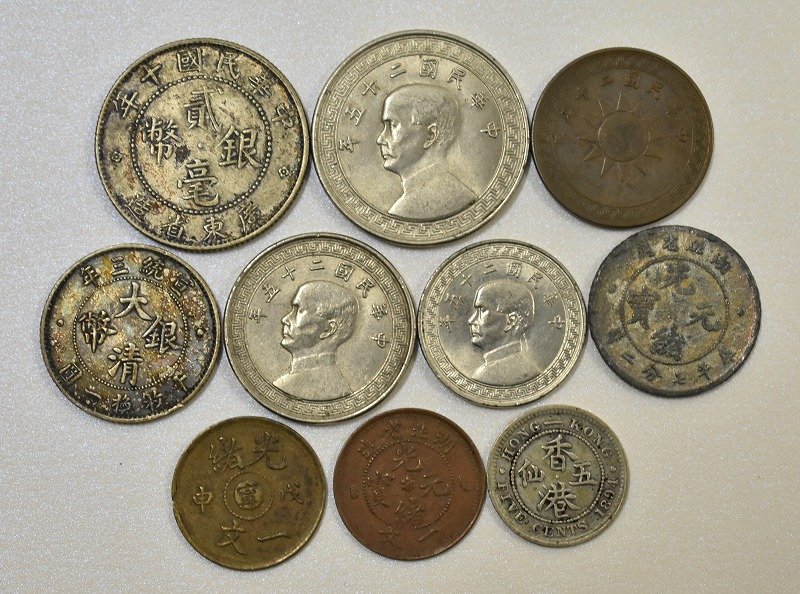 中国美術買取【福井県坂井市】のお客様より◆中国古銭 中華民國十年 廣東省造 貳毫銀幣 宣統三年 大清銀幣 壹角 光緒元寶 香港五仙◆をお買取り。