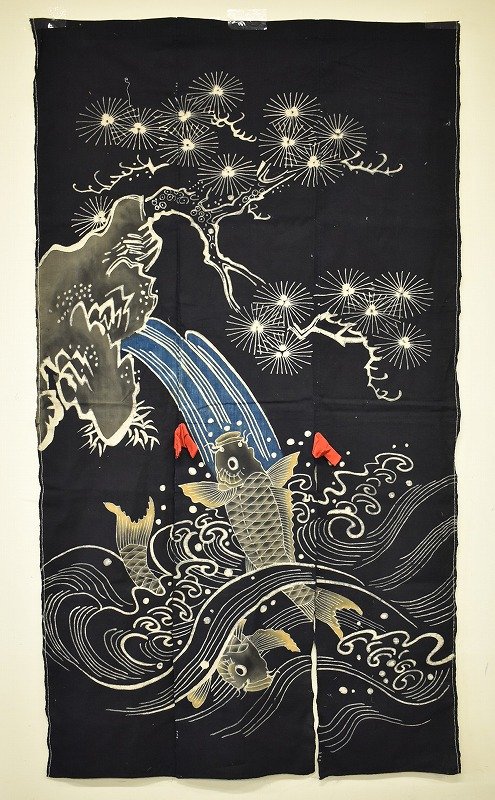 福井県福井市のお客様に出張買取にてご依頼頂き、時代物 古布 暖簾 のれん 波に双鯉 染布暖簾を買取りさせて頂きました。