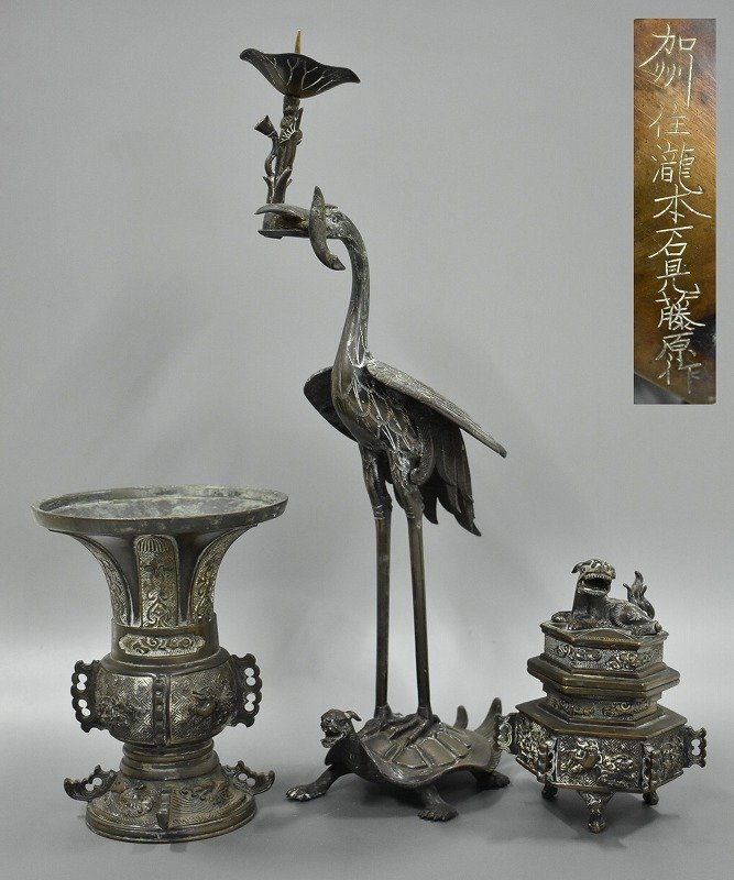 富山県高岡市のお客様に出張買取にてご依頼頂き、時代 仏具 加州住 瀧本石見 藤原尹治作 銅器 三つ具足を買取りさせて頂きました。