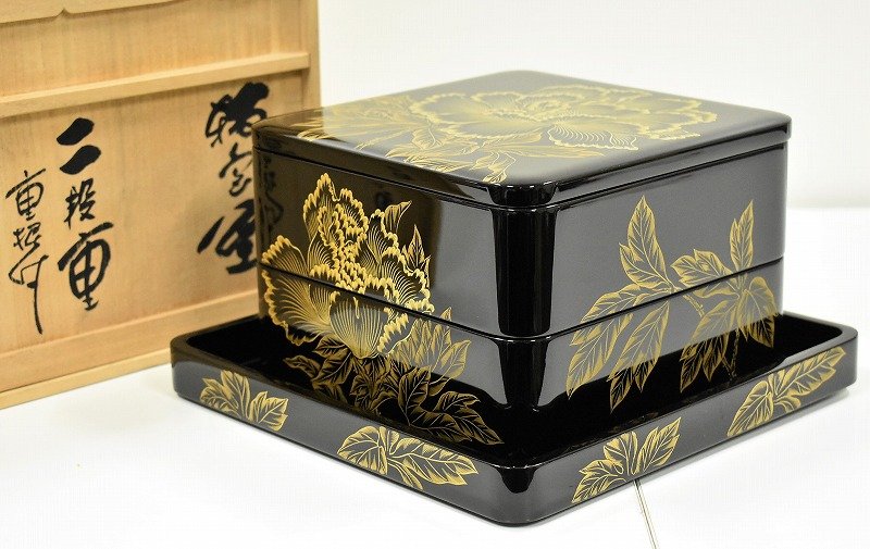 石川県金沢市のお客様に出張買取にてご依頼頂き、美品 輪島塗 任田漆器店 牡丹沈金 二段重 重箱を買取りさせて頂きました。