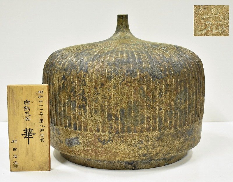 富山県高岡市のお客様に出張買取にてご依頼頂き、日展出展作品 昭和四十一年 金工家 村田宏 大型 白銅花器 華 飾壷 大花瓶を買取りさせて頂きました。