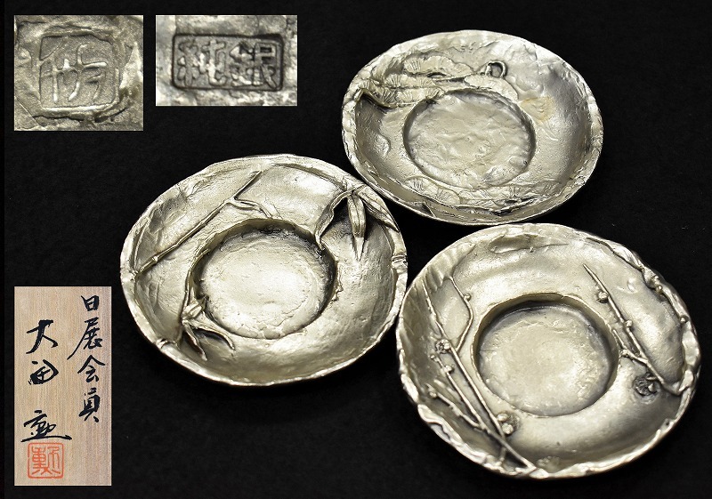 茶道具買取 銀製品買取 茶道具買取 銀製品買取【富山県高岡市】のお客様より◆高岡銅器 大角勲 純銀製 三友紋 松竹梅 茶托◆をお買取り。富山県高岡市のお客様より出張買取にてご依頼頂き、高岡銅器 大角勲 純銀製 三友紋 松竹梅 茶托を買取りさせていただきました。 計603g 共箱あり。 煎茶道具 日展会員 茶器 銀製品買取 銀製品ですがクラップではなく製品としての買取りとなりました。