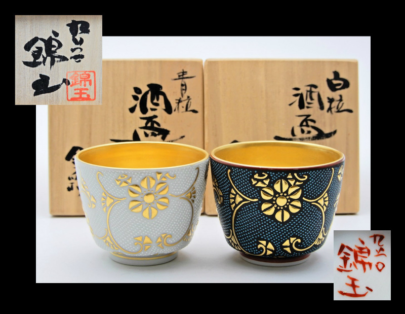 石川県金沢市のお客様より出張買取にてご依頼頂き、九谷焼 仲田錦玉 盛金 青粒金彩 白粒金彩 唐草文 内金 ぐい呑み二客を買取りさせていただきました。