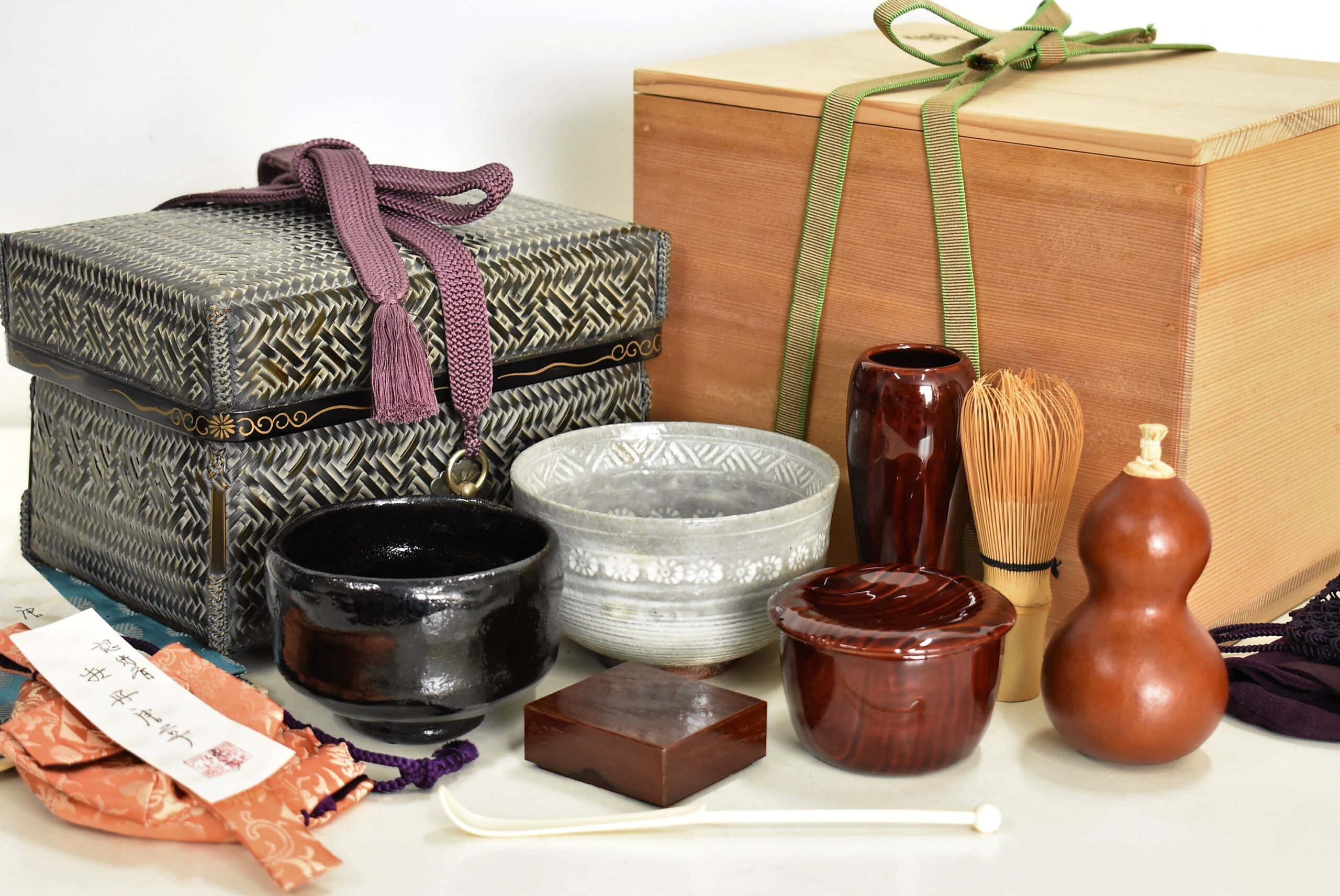 野口雨秋の茶箱、佐々木松楽の黒茶碗、瓢箪振出、茶筅、茶匙など、