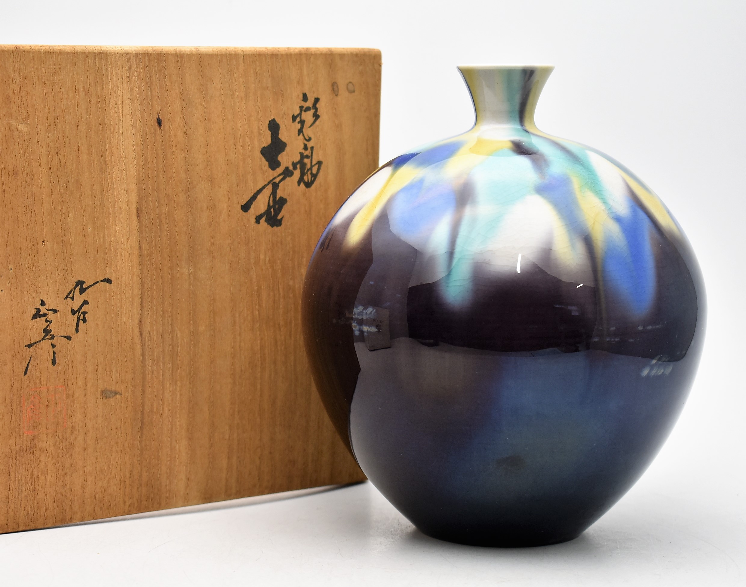 石川県小松市のお客様に出張買取にてご依頼頂き、九谷焼人間国宝三代徳田八十吉(正彦)彩釉壷三彩壷を買取りさせて頂きました。