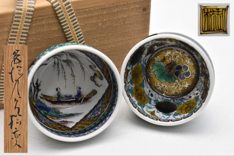 九谷焼買取 骨董品買取 九谷焼買取 骨董品買取【石川県能美市】のお客様より◆九谷焼 名工 宮本忠夫 色絵九谷絵変 酒盃◆をお買取り。石川県能美市のお客様に出張買取にてご依頼頂き、九谷焼 名工 宮本忠夫 色絵九谷絵変 酒盃を買取りさせて頂きました。 一対 共箱あり。 酒器 菊花紋 人物図懐石道具 九谷焼買取 アンティーク買取 古道具買取