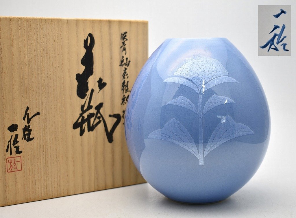 九谷焼買取石川県金沢市◆石川県無形文化財 九谷焼 名工 中田一於 淡青釉裏銀彩花文 花瓶◆をお買取り。