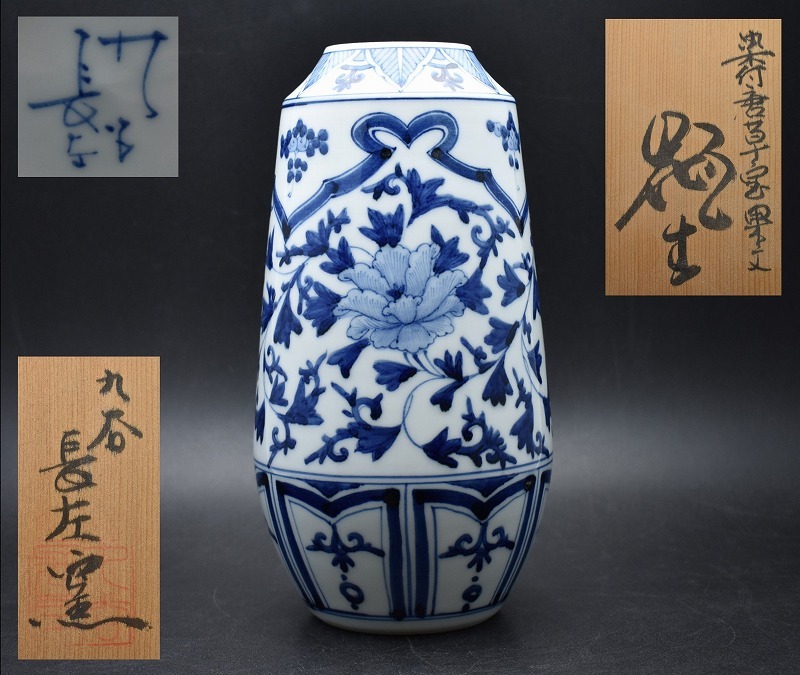 九谷焼買取 骨董品買取【石川県羽咋市】のお客様より◆九谷焼 妙泉陶房 山本長左 染付唐草宝果文 瓶生 花器 ◆をお買取り。