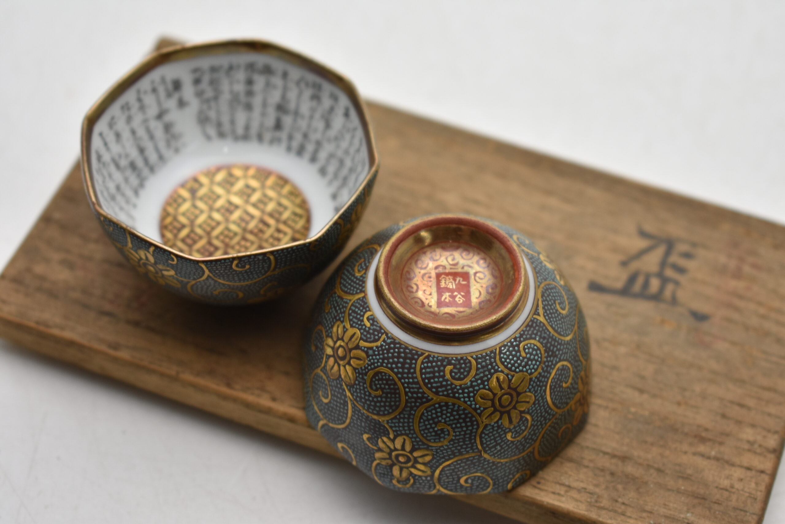 九谷焼買取 骨董品買取石川県七尾市◆時代 九谷焼 鏑木製 金彩青粒細字 盃 一対◆をお買取り。