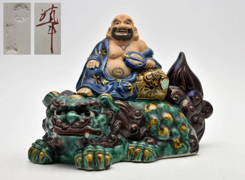アンティーク買取 九谷焼・輪島塗 九谷焼買取 骨董品買取◆石川県能美市のお客様より◆九谷焼 八幡窯 須栄義 糠川清章 青獅子に布袋尊 唐獅子 狛犬 香炉 をお買取り。