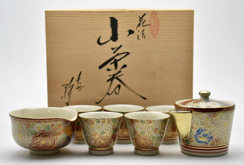 ギフト品買取 九谷焼・輪島塗 九谷焼買取 煎茶道具買取◆石川県金沢市のお客様より◆九谷焼 鶴峰堂 金襴手 色絵金彩花詰文 小茶器 宝瓶急須 湯冷 煎茶碗 茶杯 共箱 をお買取り。