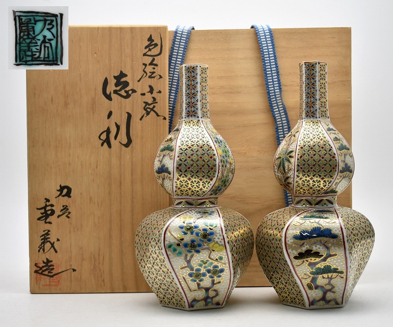 九谷焼・輪島塗 九谷焼買取 骨董品買取【石川県小松市】のお客様より◆九谷焼 山本重義 金襴手 色絵松竹梅小紋 捻瓢形 徳利酒器 一対◆をお買取り。