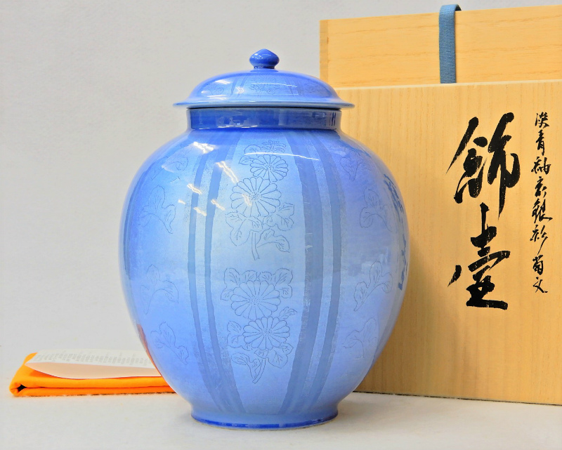九谷焼買取 骨董品買取【石川県小松市】のお客様より◆九谷焼名工 中田一於 淡青釉裏銀彩菊文飾壷◆をお買取り。