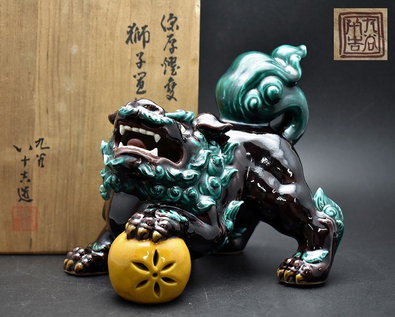 とても迫力のある顔です。近年人気の高まっている九谷焼獅子置物です。共箱あり。