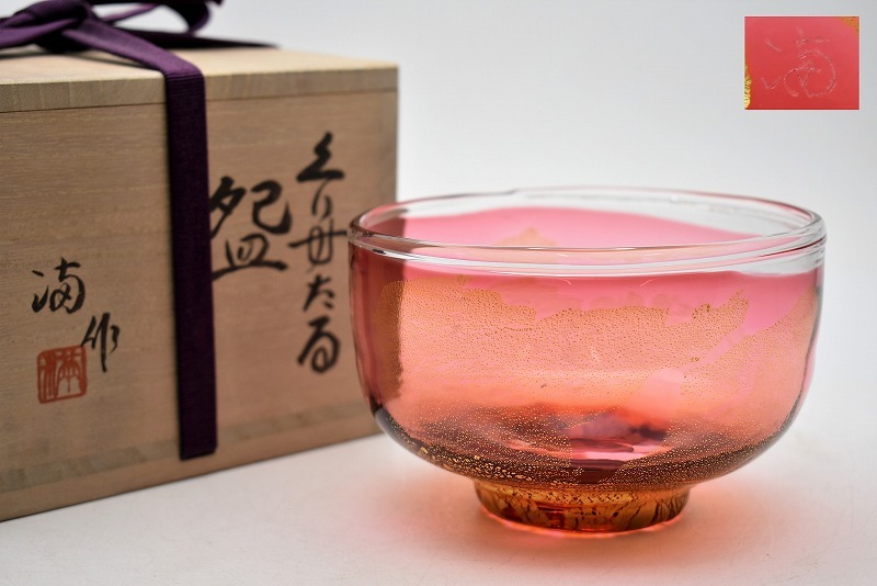 富山県富山市のお客様より出張買取にてご依頼頂き、各務満 くりすたる 色硝子 碗 茶碗 茶器 共箱 金彩 ピンクを買取りさせていただきました。