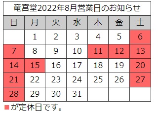 ☆竜宮堂8月店舗営業日のお知らせ☆
