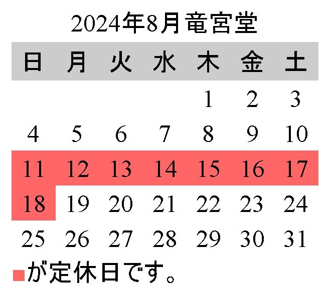 竜宮堂 竜宮の酒の令和6年8月の店舗営業日のお知らせです。