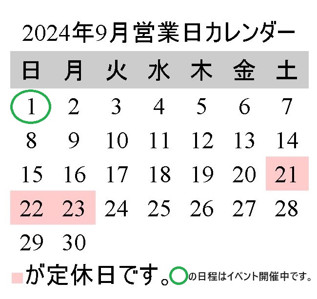 竜宮堂 竜宮の酒の令和6年9月の店舗営業日のお知らせです。