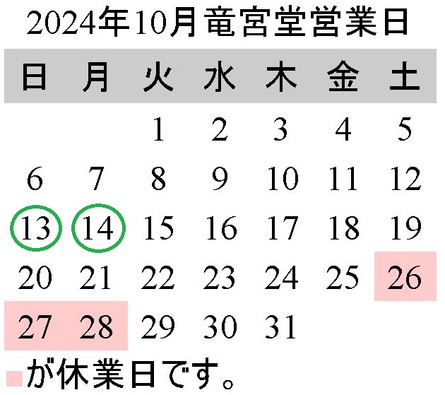 竜宮堂 竜宮の酒の令和6年10月の店舗営業日のお知らせです。