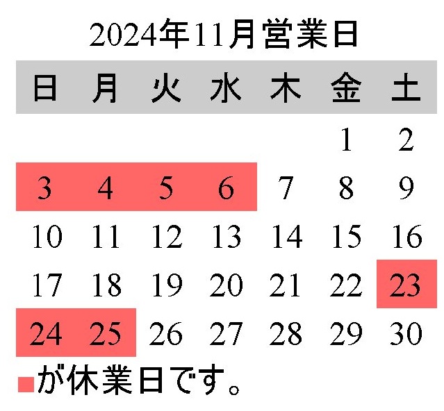 竜宮堂 竜宮の酒の令和6年11月の店舗営業日のお知らせです。
