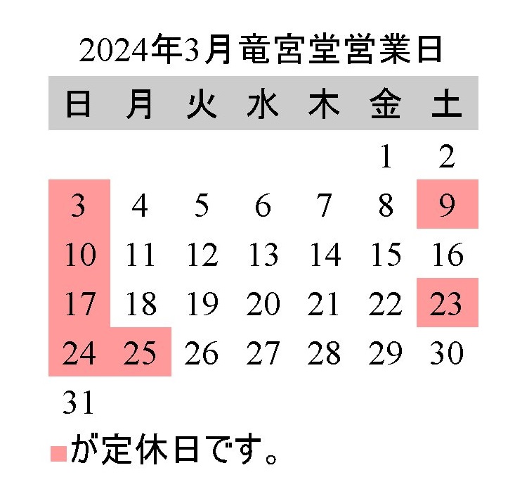 竜宮堂 竜宮の酒の令和6年3月の店舗営業日のお知らせです。