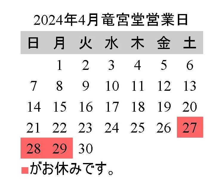 竜宮堂 竜宮の酒の令和6年4月の店舗営業日のお知らせです。