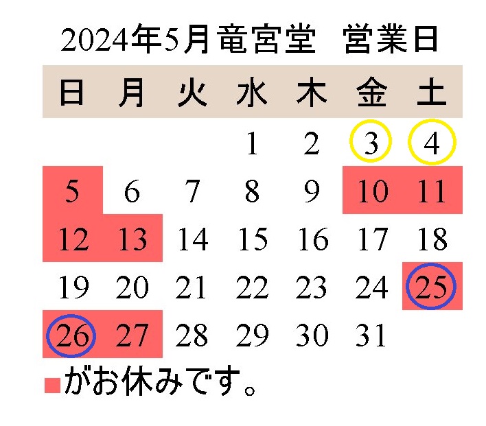 竜宮堂 竜宮の酒の令和6年5月の店舗営業日のお知らせです。