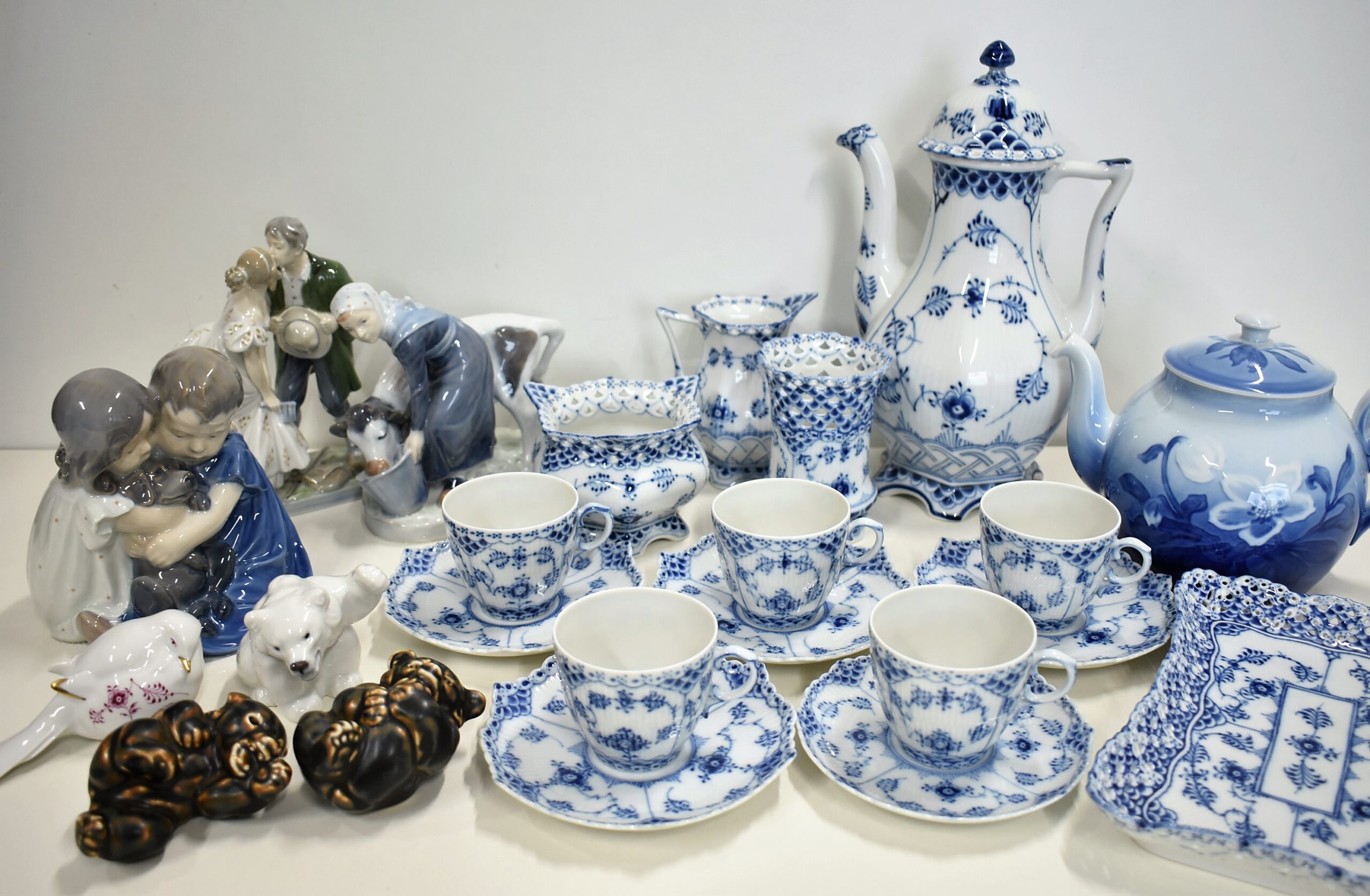 ティーセットデンマーク製で絵付けはすべて手描きで、製品の裏側にはロイヤルコペンハーゲンのマークと、アーティストのサイン、シェーブナンパーが入れられています。コバルトブルーが特徴です。